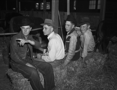 Southwestern Exposition and Fat Stock Show attendees are Jones County 4-H Club boys (left to right) Jim Dickson, Noodle, Texas, Joe Davis, Stamford, Texas, Weldon Barbie, Noodle, Texas and Erwin Boucum of Anson, Texas. The four boys arrived early with baby beeves to show, and are sitting on a stack of hay side by side each other wearing cowboy outfits.