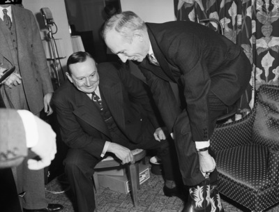 Democrats attending the President George Washingon Birthday dinner at the Hotel Texas. Sid Richardson, Fort Worth, Texas, oil man watching Eugene Casey don a pair of cowboy boots.