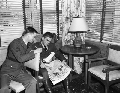 Soldiers at Camp Bowie now find recreation in one of the finest recreation centers in the country. It's Brownwood's new $69,000 United Service Organization (U. S. O.) Club recently completed and dedicated amid gay festivities. Sergeant J. W. Smith of Houston, left and Corporal Francis Abel of Fort Madison, Iowa, are pictured here. They are shown seated in chairs in a section of the library reading room. Sergeant Smith is holding a pencil. He is submitting a letter for approval to Corporal Abel. They are dressed in military uniforms and smiling. Corporal Able is holding a copy of the Fort Worth Star-Telegram newspaper. Published in the Fort Worth Star-Telegram morning edition, March 15, 1942.