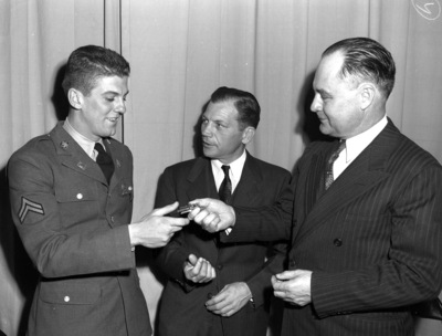 $69,000 United Services Organizations (USO) Club at Brownwood, Texas was dedicated Monday, February 23, 1942. Keys changed hands six times. In this scene Dick Dixson, center, field recreation representative for the Federal Security Agency, finally directed E. B. Germany, right, State United Services Organizations (USO) chairman, to hand them to Corporal (Corp.) Francis Abel of Fort Madison, Iowa. Mr. Germany is handing over the keys to Corporal (Corp.) Abel, who is looking down at the keys. Mr. Dixson is looking directly at Abel and motioning with his hands, as if in mid-sentence. Corporal (Corp.) Abel is dressed in military uniform. Both Mr. Dixon and Mr. Germany are dressed in suits and ties. Published in the Fort Worth Star-Telegram morning edition, February 25, 1942.