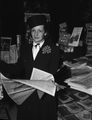 Southwestern Exposition and Fat Stock Show attendee Mrs. J. P. Miller of Coleman, Texas, is seen standing holding a newspaper in her hands in a room covered with newspapers. She has on a hat, women's suit, and some designer balls on her top left shoulders.