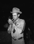Southwestern Exposition and Fat Stock Show attendee Tom Owens, Ozona, Texas, is seen in his sheriff's uniform and hat, lighting a cigarette.