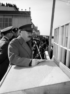 When 219 new aviation mechanics were graduated at the Air Corps technical training school at Sheppard Field, Wichita Falls, Colonel E. C. Black, commanding officer at the microphone. Published in the Fort Worth Star-Telegram morning edition, February 26, 1942.
