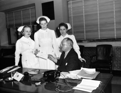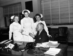 Red Cross donations by Saint Joseph Hospital nurses. R. M. Bowen accepting check from Mrs. Florence Williams while Miss Fae Canuteson, left, and Miss Tad Tippit look on.