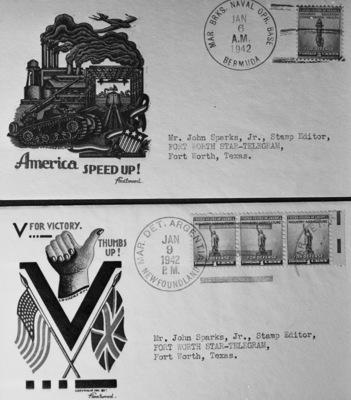 Two cachets: cover from Marine Barracks, Naval Operations Base, Bermuda and cover from Marine Detachment at Newfoundland. The Marine Barracks cover features a drawing of a factory with belching smokestacks, an airplane, a train and patriotic bunting. The second cachet features a drawing of both the United States and Great Britain's Union Jack flags on flagpoles and tilted to form a "V" shape. Within that space is the letter V. Above that is a hand posed in the "thumbs up! position. Above the thumb is the slogan "V for Victory." The names L. W. Staehle and Fleetwood are part of the design. Both were created by the Fleetwood Cover Service and designed by L. W. Staehle, well known for his award-winning cachets.