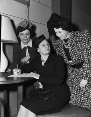 The United Service Organizations (U. S. O.) is planning activities in Mineral Wells, Texas for the soldiers at Camp Wolters. Left to right are Mrs. Georgianna Stary, Mrs. Richard Wicklund, and Mrs. Lura Bess Florey. They are in conference, deciding what they can do to entertain the military men. Mrs. Stary is the USO director at the Young Women's Christian associations. She is wearing a floral hat, collared blouse, and a sweater. Mrs. Wicklund is dressed in a hat, blouse, brooch, blazer, and a skirt. Mrs. Florey is wearing a hat and a patterned dress, belted at the waist. Published in the Fort Worth Star-Telegram morning edition, March 5, 1942.