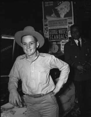 Southwestern Exposition and Fat Stock Show attendee Waddell Strain, 15 year old Future Farmers of America member from Colorado City, Texas, is seen leaning on his right shoulder as he holds his left waste with his left hand. He is wearing a button down shirt, hat, and khaki pants.