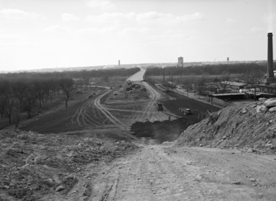 The first concrete goes down on the west half of the new Hemphill Street paving, with workmen hard at it in the area between Biddison and Shaw and moving northward at the rate of about 900 feet daily. Image shows an overview of the base of what will be the newly constructed Hemphill St. Trucks and construction crews can be seen. Published in Fort Worth Star-Telegram evening edition February 27, 1942.