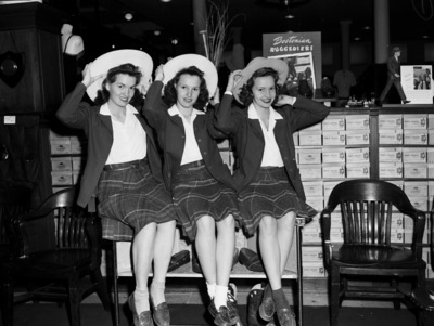 Southwestern Exposition and Fat Stock Show. Advance publicity. Elaine, Maureen and Kathleen, left to right, 17 years old triplet daughters of Mr. and Mrs. Guy Briant, in western costumes.