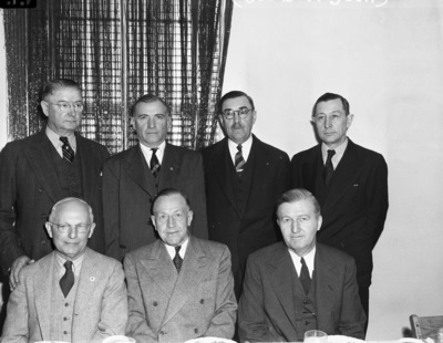 Bridgeport-Decatur Lions Club. Meeting honoring Governor Stevenson. Back row, left to right, Steve Cook, W. K. Stripling and Dan Priest, and C. L. McNair. Front row, Dr. C. A. Hickman, Joe B. Hogsett and E. E. Bewley, all representatives of Tarrant County Water Control and IMprovement District No. 1.