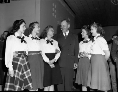 Governor Stevenson at Decatur and Bridgeport. Decatur High School Seniors and Governor Stevenson, left to right, Virginia Ann Christie, Minnie Slemp, Emma Ruth Kincaid, Governor Coke R. Stevenson, Sarah Louise Brewer and Bennye Heathington.