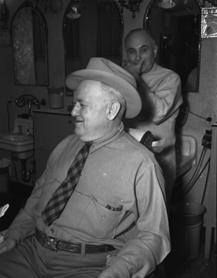 Southwestern Exposition and Fat Stock Show attendee John G. Burket, Lincoln, Nebraska, is seen sitting down at a barber shop about to get a cut of some sort. He is seen wearing a hat, tie, button down shirt, that has three cigars in the left top pocket. The barber is standing behind him holding his mouth.