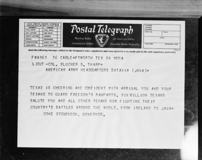Image is a copy of the telegraph forwarded to Texas troops in Java by Governor Stevenson and the Star-Telegram. Message of the telegraph is that Texas citizens are cheering for troops overseas. Published in Fort Worth Star-Telegram morning edition March 1, 1942.