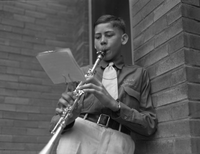 Southwestern Exposition and Fat Stock Show participant and Future Farmers of America band member Jodie Hamilton, seen leaning against a brick wall playing a flute.