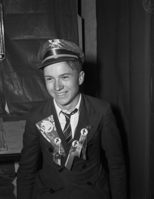 Southwestern Exposition and Fat Stock Show attendee Tommy Cole Murley of Leonard, Texas, seen wearing a hat and suit with some decorations pinned to the coat.