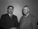Southwestern Exposition and Fat Stock Show attendees (left to right) W. E. Williams, Cotulla, Texas and Charles D. Parker of Kingsville, Texas, standing side by side wearing suits as they look towards a direction.
