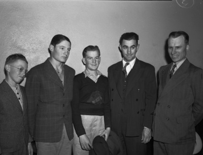Southwestern Exposition and Fat Stock Show goers (left to right) Jack Earl Creel, S. E. Stanfield, W. L. Williangham and Jess Todd and chapter advisor Walker Todd are members of the Seagraves Future Farmers of America meat judging team. All guys are standing side by side each other in a room against a wall.