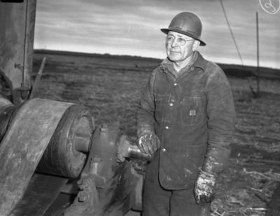 Development is being continued at a brisk pace in the Wimberly pool of southern Jones County, Texas, across the line from Taylor County. One of the men engaged in the exploration is driller Tom Clifton at the No. 2-A Wimberly. Mr. Clifton is in work clothes and a hard hat and is standing beside a large piece of machinery in the field. Published in the Fort Worth Star-Telegram morning edition, March 22, 1942.