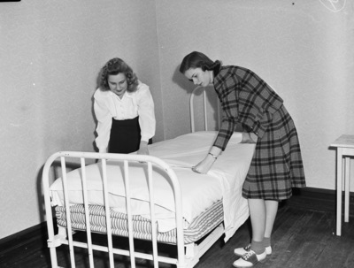 Mary Hardin-Baylor defense efforts. Mary Jo Smith, Goose Creek, left, and Annette Hensley, Itasca, making a bed.