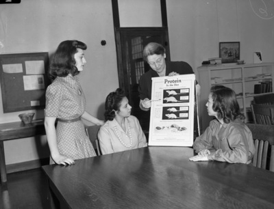Mary Hardin-Baylor defense efforts. Left to right, Bessie Joiner, Hamlin; Louise Duke, EL Paso, Texas, and Faye Shaw, Belton, students listening to Miss Rowena Anderson, instructor.