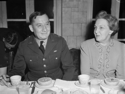 Brigadier General E. F. Reinhardt, commander of Camp Wolters, and Mrs. Reinhardt attending the annual Palo Pinto County Livestock Association banquet in Mineral Wells, Texas. The couple were honor guests at the banquet. They are sitting at a dining table and in front of them are napkins, cups and plates with grapefruit halves. General Reinhardt is wearing a military uniform and his wife is wearing a jacket that has a pattern running down the center. Behind them, at the far left, is an unnamed man who is bent over slightly as if he was reaching for something. Two large windows can also be seen in the background.