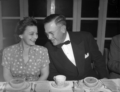 Mr. and Mrs. Pat Dalton, of Mineral Wells, Texas, attending the annual Palo Pinto County Livestock Association banquet in Mineral Wells, Texas. Mr. Dalton, an organizer of the association, was banquet toastmaster. They are seated at a dinner table and appear to be engaged in conversation; their bodies are facing forward towards the camera but they have their heads turned towards each other. Mr. Dalton is wearing a dark suit with a bow tie and his wife is wearing a short-sleeve dress with a star-like print on it. On the dinner table are silverware, cups and plates with grapefruit halves.