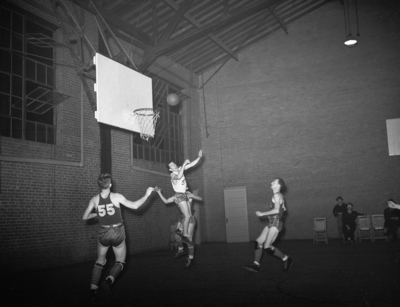 Image shows a Championship basketball game on Friday night between Texas Wesleyan College (T. W. C.) and Abilene Christian College (A. C. C.). Four unidentified basketball players are shown struggling to block the shot . From left to right, (55) is looking on while unidentified player attempts to score in basketball game. This shot put Texas Wesleyan College in the lead at 18-14 just before halftime. The players are wearing their team uniforms. Published in The Fort Worth Star-Telegram morning edition, March 9, 1940.