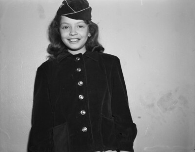 Lee Ann Lane is the 10-year-old daughter of Mr. and Mrs. L. J. Lane. She is standing in front of a blank wall, wearing a buttoned up corduroy coat and a hat. She is smiling. March 13, 1942, was the second time her birthday fell on Friday the 13th.