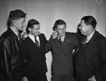 Southwestern Exposition and Fat Stock Show attendees and Denison Future Farmers of America meat judging team members are (left to right) Raymond Atkins, Earle Steele Ossie Wright and Doyle Williams, coach. All the guys are seen holding each other by the shoulder linked side by side in a room against a wall.