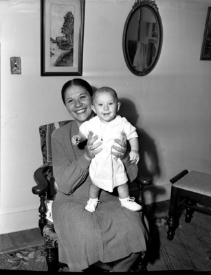 Mrs. E. W. Morris and Mary Sue Morris (7 months old). Mrs. Morris is shown sitting in an armchair with her young daughter on her lap. Mrs. Morris is wearing a long-sleeve dress and Mary Sue is wearing a small dress and a necklace. Behind the duo is a wall with a framed picture and a oval-shaped mirror hanging. To the right is a small foot rest. Mrs. Morris and her daughter are staying with her mother, Mrs. M. G. Boone, after moving from Hawaii due to the Pearl Harbor bombing.