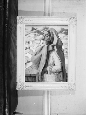 "Mexican Woman," an oil painting by Edmund Kinzinger of Waco, Texas won the Southwestern Exposition and Fat Stock Show first place prize at the Fort Worth Art Associations annual West Texas Art Show. The Show was held in the gallery at the Fort Worth Public Library. The painting is of a Mexican woman wearing a shawl and carrying a basket of fruit. Behind her is a village with mountains in the background. The painting is in a white painted wood frame. This photograph was published in the March 4, 1942 morning edition of the Star-Telegram.