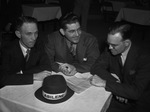 Southwestern Exposition and Fat Stock Show attendees and Abilene delegation members are (left to right) Merle Druver, Abilene Chamber of Commerce manager, Eddie Cockrell, Abilene, Texas and Jack Simmons. All three men are sitting around a table that has a hat sitting in the middle of it labeled Abilene. The men wearing suits are engaging in conversation and looking over a document.