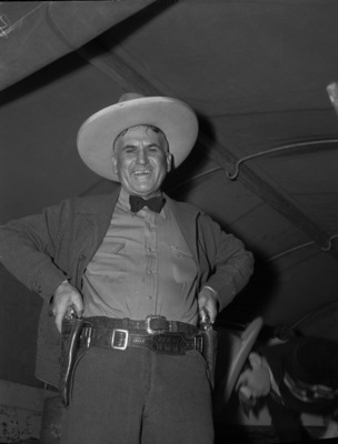Southwestern Exposition and Fat Stock Show attendee and Abilene delegation member Sheriff Will Watson of Taylor County, seen holding two guns in the holster of his pants with both hands on each side.