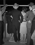 Southwestern Exposition and Fat Stock Show spectators (left to right) Edith Sweeney and Helen Seay, seen watching the Rodeo performance, rented a couple of pillows and are standing on them after removing their shoes.