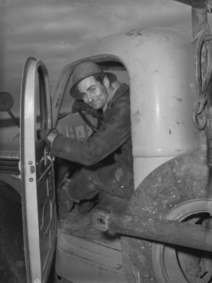 Development is being continued at a brisk pace in the Wimberly pool of southern Jones County, Texas, across the line from Taylor County. One of the men engaged in the exploration is truck driver W. P. George at the Butler & Horne No. 2-A Wimberly. He is wearing work clothes and a hard hat and is leaning out the diver's side of a truck. Published in the Fort Worth Star-Telegram morning edition, March 22, 1942.