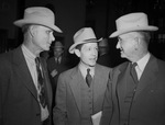 Texas and Southwestern Cattle Raisers Association convention goers (left to right) T. J. Poole of May City, Texas, Charles A. Stewart of Fort Worth, Texas and W. J. Hudgins of Hungerford, Texas, come together to discuss some freight rate problem. All three men wearing suits and a hat stand side by side engaging in conversation.
