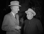Texas and Southwestern Cattle Raisers Association convention attendees (left to right) Tom East and Charles Hallows of the National Stock Yards Company, Saint Louis, Missouri. Tom East is seen standing tall wearing a suit and holding a cigarette in his hand as he talks to Hallows, who is seen also in a suit and hat.