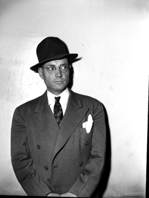 Woodson Cross standing in front of an empty wall, wearing a textured, double-breasted suit with a pair of eyeglasses and a bowler hat. He is looking to his left and has his hands clasped in front of him.