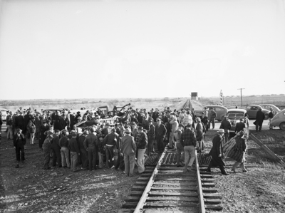 Image shows The smashed automobile of Melvin Elliot, 30, who was killed when his car collided with a Missouri Pacific Lines switch engine at East Berry Street. There is a crowd of people standing around the accident area and looking at the damaged car. There is automobiles parked on the right side of the railroad tracks. Published in the Fort Worth Star-Telegram evening edition March 9, 1942.