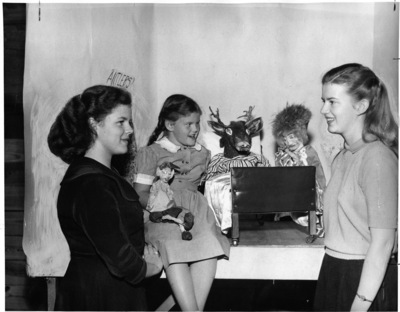 Jayne, Mary and Ann Randolph demonstrate hand puppets for WBAP TV, 1948