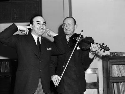 Southwestern Exposition and Fat Stock Show. Silver Spur. Dave Rubinoff, violinist, plugging his ears as Roscoe Ates, comedian, plays the violin.