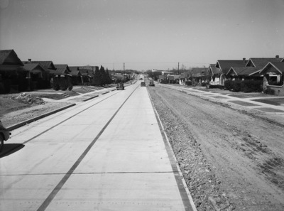 A project to widen and repave Hemphill Street between Magnolia Avenue and Biddison Street is underway. The curbs are to be set back and the pavement widened from 40 to 54 feet.The improvement, costing $178,000, is being made by the State Highway Department. Shown here is a contrast between the newly paved section of the street and the section being prepared for paving. On the paved section, there are two parked automobiles, and a few driving up the street. In the distance, a Road Roller drives down the unpaved section, compacting the soil.
