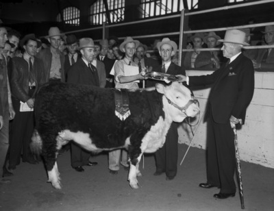 Van Zandt Jarvis, president of Southwestern Exposition and Fat Stock Show, handing silver platter to Kenneth Lewis whose steer was named grand champion. E. A. Trowbridge, Colombia, Montana is at left and Nolan County agent , R. B. Tate is second from right. Jarvis is shown presenting a silver platter to Lewis, whose Hereford steer was named grand champion of the 1940 show.