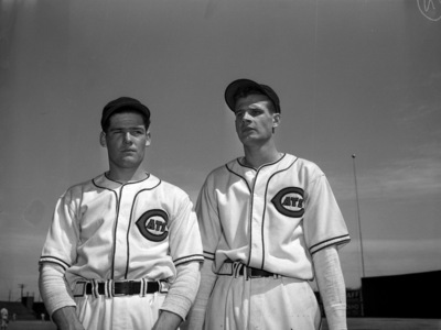 W. C. Truelove, left, and Lou Bauer, of the Fort Worth Cats, standing on LaGrave Field. Both are wearing their Fort Worth Cats baseball uniforms and caps. Truelove is looking to his left while Bauer looks to his right.