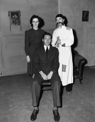 The cast of a play to be presented as a feature of the Texas Young Women's Association at Southwestern Baptist Theological Seminary. Seated is Norman Fromm (center). Standing are Eula Mae Henderson, left, and Milton Maloney, right, all seminary students. Mr. Fromm is wearing a suit and Miss Henderson is wearing a dress. Published in the Fort Worth Star-Telegram Morning edition March 13 1942.