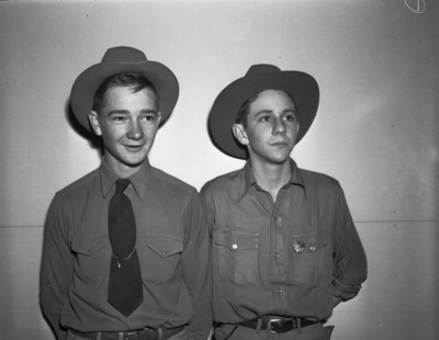 (Left to right) J. P. Miller Junior and W. D. Stockstill, both Future Farmers of America members standing side by side each other against a wall, wearing cowboy hats and a button down shirt.