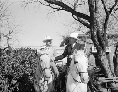 Amon Carter, Sr. (left) and Schuyler Kudner (right) of Arthur Kudner Advertising Agency in New York, on horseback and shaking hands during Kudner's visit to Fort Worth. He was Carter's guest and the picture was taken on the occasion of the Stock Show and Rodeo Parade.