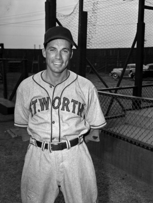 Claude Horton, pitcher for the Fort Worth Cats minor league baseball team. Horton is standing outside, leaned against a fence with his hands behind his back. He is wearing his baseball uniform which has "Fort Worth" across the front of the jersey. Behind him a small lot can be seen with a few cars parked.