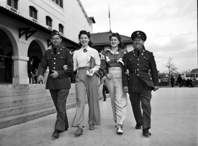 Among visitors to the Southwestern Exposition and Fat Stock Show were, left to right, Staff Sergeant J. F. Casey, of New Orleans, Louisiana, Misses Margaret Hutcheson and Nan Sandefur, both of Fort Worth, Texas, and Staff Sergeant Medric J. Blanchard, of New Orleans, Louisiana. The group of four are walking arm in arm down the midway of the Stock Show grounds. Sergeants Casey and Blanchard are wearing their military uniforms. Miss Hutcheson is wearing a long-sleeve blouse tucked into trousers. She is carrying a small, souvenir cowboy boot in her left hand and has a handbag tucked under her left arm. Miss Sandefur is wearing a floral print, long-sleeve blouse and trousers.