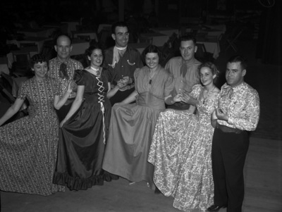 Members of the Mineral Wells Square dance team entertaining goers to the Southwestern Exposition and Fat Stock Show include (left to right) Mrs. Orval Shore, Mr. Shore, Ms. Lola Perry, Jim Barclay, Mrs. Homer Archer, Mr. Archer, Ms. Sidney Miller and John Winters. Musicians and dancers from Mineral Wells and Post shown standing on the dance floor, provided the spark which opened Sunday's chain of events.